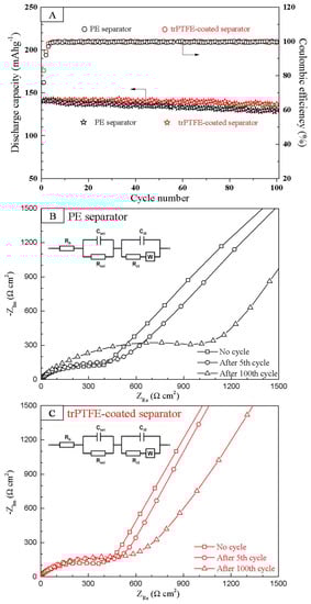 Figure 8A depicts the cyclability of the cells with the PE separator and the trPTFE-coated separator as a function of the cycle number. Both separators exhibited relatively stable coulombic efficiency. For the PE separator, its coulombic efficiency was only 76.1% when a current density of 0.5 C was used for both the charge and discharge processes, and then, its coulombic efficiency steeply increased to about 99.6% in the subsequent cycles. The trPTFE-coated separator showed a higher first coulombic efficiency (83.5%), though it had a similar tendency with respect to its coulombic efficiency, which may be attributed to its favorable electrolyte affinity. The discharge capacity of both cells decreased slightly with cycling, which may be ascribed to little change in internal impedance [1,25], and the discharge capacity of the trPTFE-coated separator appeared to be slightly higher than that of the PE separator up to 100 cycles. The capacity retention after the 100th cycle was found to be 97% for the trPTFE-coated separator and 91% for the PE separator, respectively. The excellent cyclability can be explained by previous studies [26,27]. The trPTFE-coated separator had superior wettability than the hydrophobic PE separator alone, which contributed to sufficient contact with the electrolyte during cycling. Moreover, the electrochemical impedance spectra of the cells after the 5th and 100th cycle were analyzed to evaluate the cyclability in this study, as shown in Figure 8B,C. The EIS (electrochemical impedance spectroscopy) data can be fitted by an equivalent circuit shown in the inset of Figure 8B,C. The Rb is the bulk resistance of the cell, which reflects the electric conductivity of the electrolyte, separator, and electrodes; Rsei and Csei are the resistance and capacitance of the solid-state interface layer formed on the surface of the electrodes, respectively; Rct and Cdl are the charge-transfer resistance and its relative double-layer capacitance, respectively; and W is the Warburg impedance related to a combination of the diffusional effects of the lithium ion on the interface. The main parameters obtained by fitting the Nyquist plots are listed in Table 2. The impedance of the cell assembled with the PE separator significantly increased after the 100th cycle, which had a negative influence on cell capacity. In comparison with the PE separator, the trPTFE-coated separator only increased a little in the cell impedance. This suppressed growth in the cell impedance may be attributed to its high electrolyte uptake in the cell during cycling, which confirms again the above conclusion.