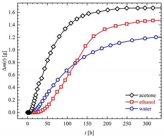 The temporal mass gain of Estane samples immersed in three different solvents (water, ethanol, and acetone) at θ = 20 °C is depicted in Figure 1. The maximum amount of solvent which can be uptaken by Estane is called the saturation value for increase of mass and is denoted by . The solubility of water in Estane is very limited and after a period of two weeks, Estane is fully saturated with water. A saturation value for increase of mass developed over the course of the experiment was measured to be around 3 wt % for water. However, clearly much higher amounts of ethanol and acetone—Up to 15 and 35 wt %, respectively—Can be taken up by the specimen.