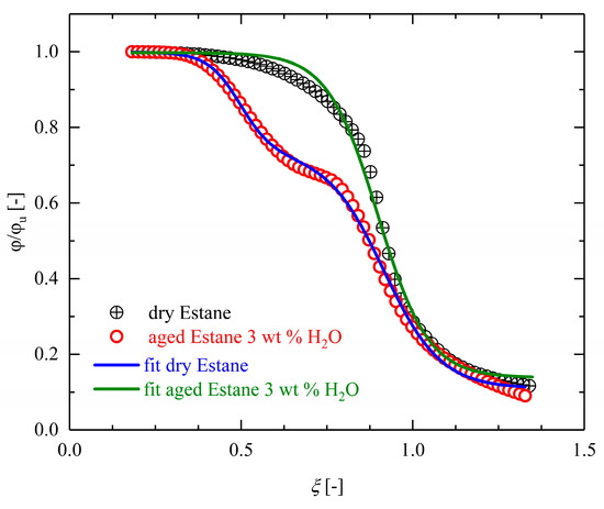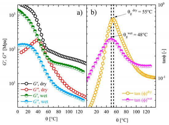 The temperature dependencies of the storage modulus G′ and loss modulus G″ of Estane are depicted in Figure 2a. It can be observed that the storage moduli of dry and hydrolytically (physically) aged samples decrease gradually until the associated glass transition temperature is reached. The loss factor (tanϕ)dry of dry samples increases progressively up to its maximum, where the rheological material’s dissipation energy is at supremum. This behavior is typical for physically crosslinked copolymers [6]. In contrast, the increase of the loss factor (tanϕ)wet in the hydrolytically (physically) aged samples is less pronounced (see Figure 2b).