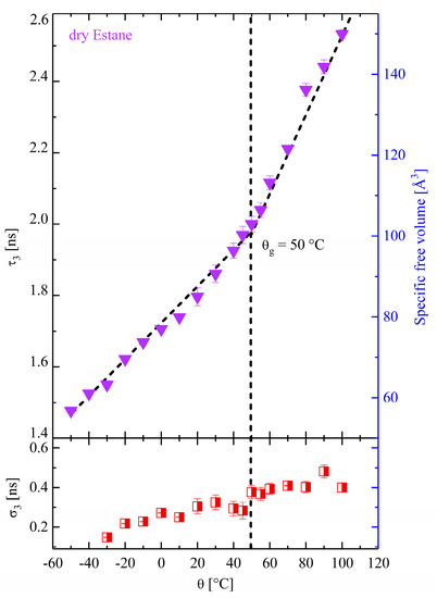 The temperature-dependent Ortho-Positronium (O-Ps) mean lifetime and its corresponding specific free volume in dry Estane (filled triangles). The standard deviation σ3 as a function of temperature is presented in the lower panel (half-filled quadrates).