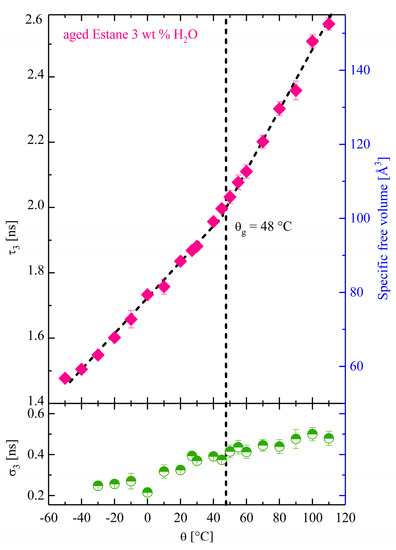 PALS results for the hydrolytically (physically) aged Estane with 3 wt % H2O are presented in Figure 4. Here, the samples show a glass transition temperature of θg ≈ 48 °C, and, thus, a glass transition lowering of about 2 °C. This agrees with the results of the DMTA tests and a hit for plasticization effects (cf. Figure 2).