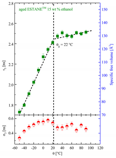 The temperature-dependent O-Ps mean lifetime and its corresponding specific free volume in physically aged Estane with 15 wt % ethanol (filled circles). The standard deviation σ3 is shown in the lower panel (half-filled circles).