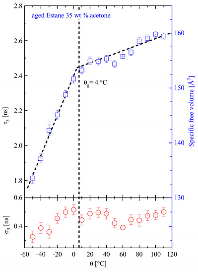 The temperature-dependent O-Ps mean lifetime and its corresponding specific free volume in physically aged Estane with 35 wt % acetone (empty quadrates). The standard deviation σ3 is presented in the lower panel (empty circles).
