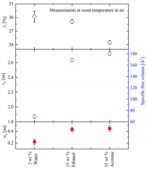The changes in the O-Ps lifetime and specific free volume with respect to temperature are shown in Figure 6 for aged samples with 35 wt % acetone. Qualitatively, the changes in the O-Ps lifetime and FV with temperature for aged samples with acetone is similar to the behavior of the aged samples with ethanol. However, a much higher amount of specific FV can be observed quantitatively, indicating that the polymer chains are pulled apart from each other. Possible reasons are the higher amount of uptaken solvent and the larger size of a single acetone molecule (nearly 4.197 Å) compared to ethanol (about 4.134 Å) [41]. Here, the FV extends from 134 Å at −50 °C to 161 Å at 90 °C.