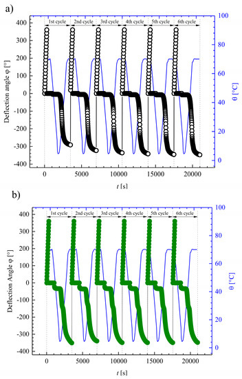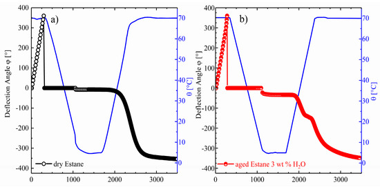 In this section, the functional properties of Estane under mechanical torsional loading are discussed. Figure 8 shows one complete thermomechanical cycle for dry and hydrolytically (physically) aged Estane. Results are presented as deflection angle (φ) versus time (t) plotted together with the respective temperature (θ), consisting of the four steps introduced in Section 2.4 of Materials and Methods: (i) heating and twisting by applying 360 degree torsion i.e., one full twist, (ii) cooling to θlow, (iii) unloading at θlow, and, finally, (iv) recovery during heating ramp to θhigh. It should be noted that, in Figure 8, for both dry and hydrolytically (physically) aged samples after φ = 360 degree deformation, the deflection angle was set to zero degrees for a better observation of the results.