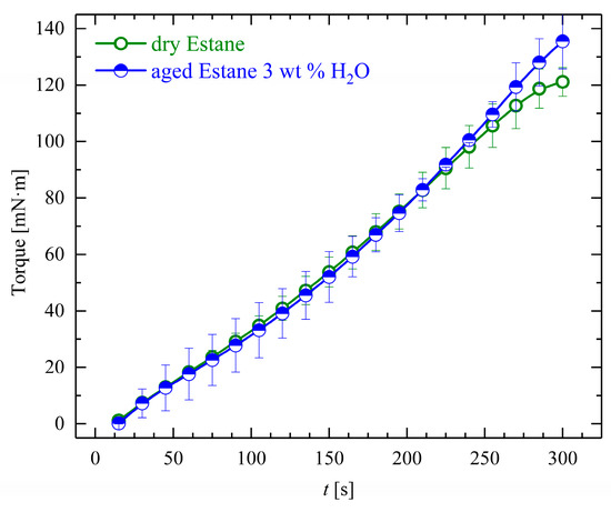 During deformation at θhigh, for both dry and hydrolytically (physically) aged samples, the obtained mean torque values overlap each other at the beginning of the deformation step, so that qualitative similar behavior could be observed. Interestingly, a slightly higher amount of torque was needed to twist the hydrolytically (physically) aged samples, as shown in Figure 10.