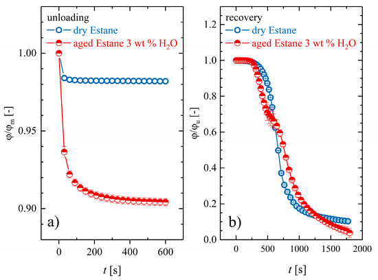 (a) The evaluation of the normalized averaged deflection angle values in relative units for the unloading step at θlow = 10 °C for dry (empty circles) and hydrolytically (physically) aged samples (half-filled circles) and (b) the evaluation of the normalized averaged deflection angle values in relative units for the recovery step (right panel) at θhigh = 70 °C for dry (empty circles) and hydrolytically (physically) aged samples (half-filled circles).