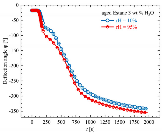 To prove whether the diffusion of water molecules out of the specimen is the reason for this observation, we performed further SM cycles under different environmental conditions; in particular, the humidity in the environmental chamber (cf. Section 2.4) was adjusted and controlled to be around 95%. This was done to minimize the concentration gradients of the system and to reduce the probability of dehydration of the samples during programming and through recovery. It is worth noting that in all previous experiments, the humidity of the chamber was set to be 10% during the whole shape-creation and recovery process. Figure 12 shows the averaged temporal development of the deflection angles of the programmed hydrolytically (physically) aged Estane during recovery under the two different physiological conditions.