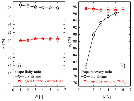 Furthermore, the shape recovery of the samples in cycles is better than in the first cycle for both the dry and the hydrolytically (physically) aged specimens. However, the shape fixities remain almost unchanged. Moreover, as depicted in Figure 8 and Figure 9, the behavior of subsequent samples converges after the first cycle. Here, the first cycles behaved as a preprocessing procedure which led to the similar pre-orientation status of macromolecular chains in both the dry and the hydrolytically (physically) aged samples, independent from the amount of incorporated water. This means that the histories of the specimen and eigenstresses produced through the extrusion and injection molding have vanished after the initial cycle.