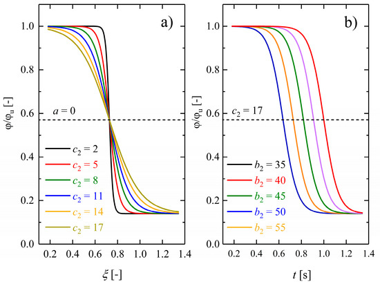 Influence of the material parameter a on the evolution of the angle as a function of the normalized temperature 𝜉 in relative units during recovery processes. The parameter a describes the mass percentage of existing water inside the samples (Equation (2)). An increase in a changes the appearance of the recovery profile from a single sigmoidal function to a double-logistic sigmoidal form. The black dash lines show the estimate transformation temperature and other asymptotic values of the suggested function in Equation (12).