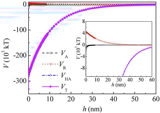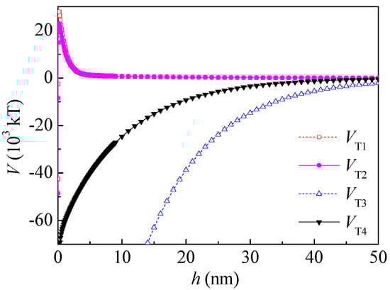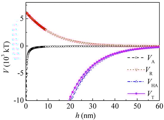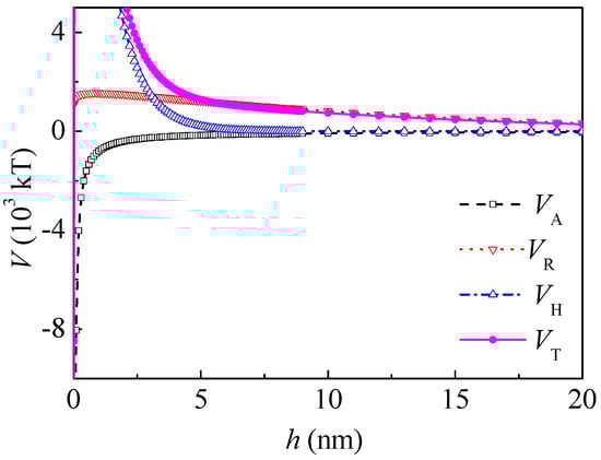 The dielectric constant of water in a vacuum ε0 = 8.854 × 10−12 C2/(J·m) and the relative dielectric constant of water εr = 78.5, there is ε = 6.95 × 10−10 C2/(J·m). In a KCl solution (1 mM), there is κ = 1.04 × 108 m−1 []. From the measurement of the zeta potential, ψ01 = ψ02 = −20 mV = −0.02 J/C. R = 5 × 10−6 m, H0 = 0 nm. According to the literature [], h0 = 10.3 nm. From Equations (5)–(8), the curves of the interaction between the coal particles calculated by the extended DLVO theory are shown in Figure 3. The total interaction energy was negative thoroughly in the range of 0–60 nm and minimums occurred, which indicate that the agglomeration of the coal particles was thermodynamically preferred. This coincides well with the literature []. The hydrophobic interaction energy VHA was about two magnitudes higher than that of the Lifshitz–van der Waals and electrostatic interactions. The VHA was relatively long-range, ranging from 0 to 60 nm. When h was 5 nm and 20 nm, VHA was −1.70 × 105 and −0.395 × 105 kT, and VT was −1.66 × 105 and −0.388 × 105 kT, respectively.