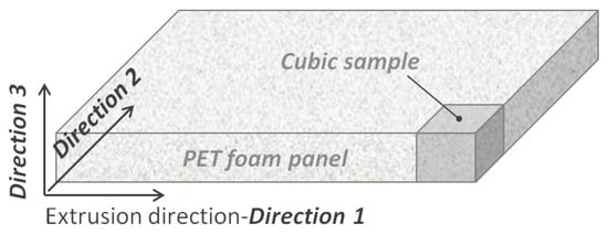 Two extruded foam panels (1000 × 600 mm2) were used with thicknesses of about 17 and 39 mm, and nominal densities of 65 and 110 kg/m3, respectively. In the following, the former foam panel with lower density and thickness is named “low-density foam”, while the latter foam panel is called “high-density foam”. Three material directions were defined on the basis of the panel orientation in the extrusion process as shown in Figure 1. “Direction 1” represents the extrusion direction, whereas “Direction 2” and “Direction 3” are taken in the transverse plane, i.e., the panel cross section. In particular, Direction 2 is aligned with the panel width and Direction 3 with the panel thickness. Cubic samples were extracted from the panels by cutting for mechanical testing and thermo-mechanical cycling. The edge length of the cubic samples was fixed equal to the thickness of the foam panel according to Figure 1, therefore 17 × 17 × 17 mm3 samples were cut from the low-density panel and 39 × 39 × 39 mm3 samples from the high density panel.