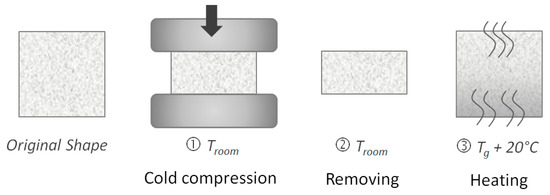 Apart from polyurethane-based foams which are mainly thermosetting, most foams are thermoplastics. However, the shape memory properties related to the foam structure induced by the production process, have not been fully investigated. In particular, the properties of the memory of thermoplastic foams have been evaluated for polycaprolactone (PCL), microbial polyester (poly-hydroxybutyrate-hydroxyvalerate, PHBV), and their mixture (PCL/PHBV) [14]. After training, in the best case, a 100% shape recovery was achieved on 30% compressed PHBV foams. There was a linear dependence of the recovery stress on the temperature, but no correlation with the compression direction or the foam structure was studied. PCL, PHBV, and PCL/PHBV foams are soft at room temperature, and fix the deformed shape by cooling. A different behavior was found in thermoplastic PET (polyethylene-terephthalate) foams, which are rigid at room temperature [15]. PET foams exhibit good shape-memory properties also by performing the memorizing step in cold conditions. This is quite a rare occurrence in the world of SMPs as typically these polymers are strongly damaged when deformed in a rigid state. Small cubic samples were subjected to a memory-recovery cycle which consisted of a cold compression to reduce the foam sample thickness up to 50%, and a subsequent recovery of the shape by heating the samples in a muffle. Final recovery from 97% to 100% was found as a function of the compression direction.