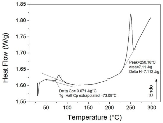 By assuming a bulk density of 1.38 g/cm3, a relative density of 5% and 8% results for the low and high-density foam. Indeed, most of the foam volume is composed of voids. This is an issue for measuring material transitions with thermal analyses. Figure 3 shows the DSC curve of a high density sample. The Tg evaluation is affected by the occurrence of relaxation enthalpy but a value close to 73 °C may be inferred. The occurrence of the relaxation enthalpy peak is in agreement with the expected SM behavior as the polymer is able to freeze stresses into the structure. Moreover, that is also evidence of the strong influence of the manufacturing process on the material status. The estimated value of 73 °C for Tg is in agreement with the expected datum for this kind of resin. A melting peak is also visible in the DSC scan even if its shape and size is probably affected by low sample mass, and foam collapse into the crucible during melting. Nevertheless, a recrystallization peak, before the melting peak, seems to be absent even though it is typical for PET products. It is possible to deduce that the foam itself is close to its maximum crystallinity. After foam extrusion, the panel cooling rate is low because of the very limited thermal diffusivity, and amorphous PET is minimized.
