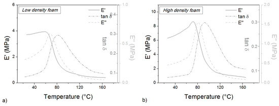 Dynamic mechanical analysis (DMA) curves for low-density (a) and high-density (b) foams.