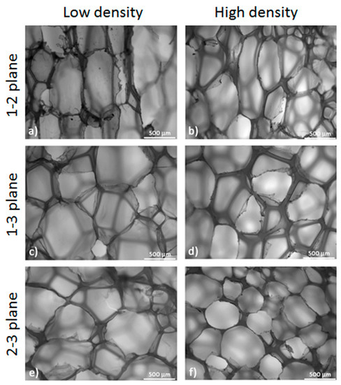 Micrographs of the two different foams along the three principal directions are shown in Figure 5. The foam structure is closed-cell with an average cell size of 0.54 mm for the high-density foam, and 0.73 mm for the low-density foam. However, the measured cell size is not uniform along all the foam directions. In the 1-2 plane, the average cell size is 0.7 and 0.98 mm, respectively, in the 2-3 plane the average cell size is 0.42 and 0.55 mm, respectively, and in the 1-3 plane, the average cell size is 0.45 and 0.59 mm, respectively. According to these observations, foam cells were mainly elongated along Direction 1 (the extrusion direction) and that is apparent from the comparison between plane 1-2 and 2-3. Cell sizes in plane 2-3 and 1-3 are comparable even if a small increase is present in the latter. A further comparison can be made in terms of the geometrical ratio of the cells along the three principal planes as reported in Table 1. For both foams, the geometrical ratio maximum is in the 1-2 plane, as qualitatively confirmed by Figure 5a,b. Between foams, the cell ratio is higher for the low density sample, where a value of 2.25 is reached. A high geometrical ratio is also present in the 1-3 plane but in this case the maximum value (1.52) is achieved by the high-density foam. However, no anisotropy is observable in the 2-3 plane for both foams. The presence of anisotropy in both the 1-2 and 1-3 planes suggests that cell elongation is not perfectly aligned with the extrusion direction.