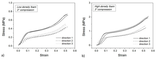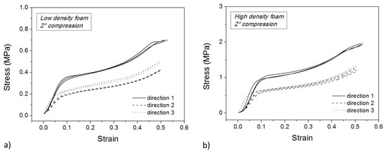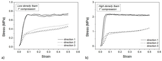 Figure 10 and Figure 11 show the compression step of the second and third thermo-mechanical cycle, respectively, for the low density (a) and high density (b) foam. These curves are similar to those of the first compression test (Figure 6) apart from the occurrence of a more pronounced densification stage at high strain. Also, the stress plateau disappears along Direction 1. In particular, the main differences in compression in Direction 1 are strongly related to the mechanical damage during the first cold compression step.