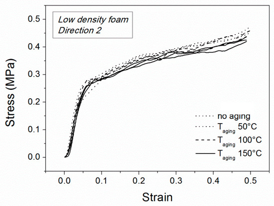 In order to investigate how the stresses during the extrusion process could affect PET foams in the first thermo-mechanical cycle, some thermal conditioning tests were performed. In particular, three aging temperatures were chosen (50, 100 and 150 °C) and uniaxial compression tests were performed on the low-density foams. The effect of the conditioning treatment on the mechanical performance is shown in Figure 7 for the low-density foam in terms of room-temperature compression curves. The non-aging condition is also reported for comparison. Direction 2 has been chosen for testing because of the low anisotropy ratio. The compression curves are qualitatively similar and they differ only in some quantitative data.
