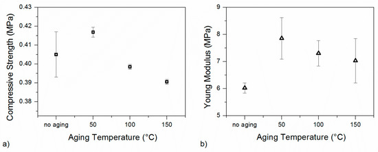 Compression strength and elastic modulus were extracted from these curves and are reported in Figure 8a,b, respectively. By increasing the conditioning temperature, the compression strength decreases but effect is small. Between the maximum (in the absence of aging) and the minimum (aging temperature of 150 °C), an 8% reduction is observed. The same effect seems to disappear in the elastic modulus which is always comparable for all the samples before and after conditioning. Results are comparable with a small material degradation due to thermal aging. This degradation is stronger above the glass transition temperature. Nevertheless, other secondary effects could be superimposed, such as recrystallization, loss of molecular orientation, residual stress recovery and thermal shrinkage. These results suggest that strong material changes during multiple thermo-mechanical cycles should not depend on temperature effects alone but on their combination with applied stresses.
