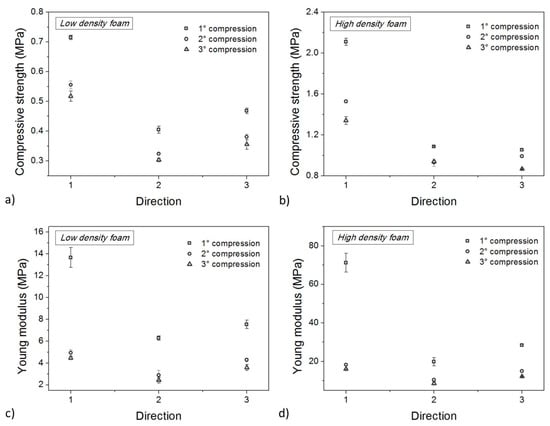 From a quantitative point of view, between the first two cycles, compressive strength along Direction 1 underwent a reduction of about 42% and 48% for low- and high-density foams respectively. Subsequently, between the second and the third cycle, a further reduction of 12% and 14% occurred. Along the same direction, the elastic modulus underwent an even more severe reduction between the first two cycles (64% for low-density foam and 67% for high-density foam) whereas the effect of the third cycle was almost negligible.