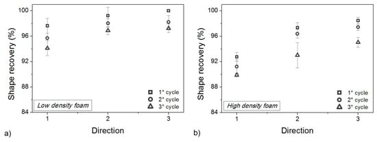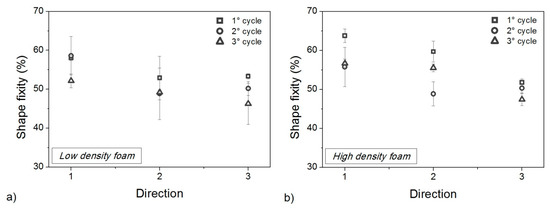 Shape fixity for low density (a) and high density (b) foam samples in all directions after each thermo-mechanical cycle.