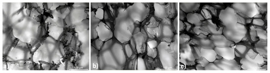 In order to confirm the correlation between foam structure and measured performances, microscopic observations were repeated at the end of each thermo-mechanical cycle. Results are shown in Figure 15 and Figure 16 for low- and high-density foam, respectively. The Figures show that many broken cells and warped cell walls appear during cycling. Because of this damage, it was not possible to estimate the geometrical ratio of cells, as was possible for un-cycled samples. The presence of these ruptures highlights that the sharp reduction of static mechanical properties of low and high density PET foams could be affected by such events. Applied memory-recovery cycles are very severe due to the cold compression step. For this reason, material damage is associated with thermo-mechanical cycles. This damage is not able to erase foam anisotropy, but stiffness and strength are reduced. Nevertheless, despite the cellular materials being partially damaged, their shape memory properties are preserved and sufficient to guarantee a shape recovery of about 90% after three thermo-mechanical cycles.