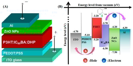 In this work, we focus on the optimization of the P3HT:IC60BA blend system by introducing a functional additive, 2,3-dihydroxypyridine (DHP, shown in Scheme 1) to generate a ternary P3HT:IC60BA:DHP blend system [,,] and improve the PV performance of BHJ PSCs in a standard device geometry: glass/ITO/poly(3,4-ethylenedioxythiophene):poly(styrene sulfonate) (PEDOT:PSS)/P3HT:IC60BA:DHP/zinc oxide nanocrystals (ZnO NCs)/Al (Figure 1A) [,,]. The selection of DHP takes into account its chemical structure (cyclic 6-π electron and presence of an electronegative nitrogen atom in the ring) and multifunctional properties (pKa = 5, pH = 8.22, a proton acceptor and intermolecular hydrogen bonding, as well as intermolecular hydrogen bond formation due to the presence of two hydroxyl groups) []. Therefore, it is reasonable to assume that the pyridine in DHP can form π–π interaction with the thiophene ring in P3HT, and the DHP molecule can form intermolecular hydrogen bond with IC60BA. These interactions could lead to optimal phase separation between P3HT and IC60BA, and modify the morphology of P3HT:IC60BA:DHP. Figure 1B depicts the energy level band gap of the studied materials. After the incorporation of DHP into P3HT:IC60BA system, the PCE of the fabricated BHJ PSCs with the ternary blend system exhibited a significant increase in PCE (~20%) as compared to the parent device. Herein, we present the details of our investigation of role of DHP towards influencing the optical, microstructural, morphological and PV properties of BHJ PSCs [,].