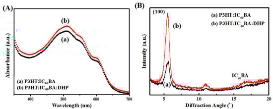 (A) Absorption spectra of (a) P3HT:IC60BA and (b) P3HT:IC60BA:DHP thin films, and (B) XRD patterns of (a) P3HT:IC60BA and (b) P3HT:IC60BA:DHP films.