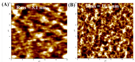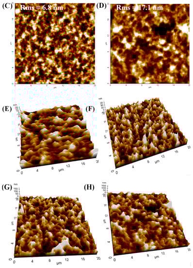 The PV performance is related to the nanomorphology of the active layer. To investigate how the inclusion of DHP influences the active layer morphology, AFM images of the ITO/PEDOT:PSS/P3HT:IC60BA and ITO/PEDOT:PSS/P3HT:IC60BA:DHP (Figure 3A–D) and its corresponding thermally annealed counterparts (Figure 3E–H) were probed []. The root mean square (RMS) roughness value determined for the ternary P3HT:IC60BA:DHP blended film was 16.1 nm, which is higher than that of the P3HT:IC60BA (5.1 nm) []. In fact, 16.1 nm is quite close to the optimal domain size (10~20 nm) of P3HT for the improved exciton dissociation []. The increase in surface roughness arises from self-assembled P3HT and IC60BA domains due to possible molecular-level interactions with DHP and solvent annealing []. In the presence of the DHP, optimal phase separation was achieved with a 3D interpenetrating network, enabling improved exciton dissociation and charge transport [,]. Compared to the film without DHP, the RMS roughness of the modified film increased from 6.8 nm to 17.1 nm after annealing at 150 °C for 10 min. While the surface of the P3HT:IC60BA film is richer in P3HT, the top surface of P3HT:IC60BA:DHP film is dominated by the presence of IC60BA domains. The preferential existence of IC60BA at the surface of P3HT:IC60BA:DHP would enhance the hydrophobicity at the interface.