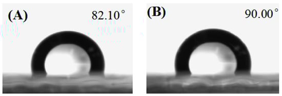 Water droplet contact angles of (A) P3HT:IC60BA and (B) P3HT:IC60BA:DHP.