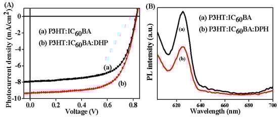 (A) J–V characteristics of the BHJ PSCs fabricated with (a) P3HT:IC60BA and (b) P3HT:IC60BA:DHP-based BHJ PSC, and (B) PL spectra of (a) P3HT:IC60BA and (b) P3HT:IC60BA:DHP thin films.