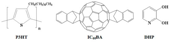 PEDOT:PSS (Clevios P VP AI. 4083, H.C. Starck, Inc., Newton, MA, USA), P3HT (molecular weight (MW) = 4500, Luminescence Technology Corp., Taiwan, China), IC60BA (MW = 953.40, Luminescence Technology Corp., Taiwan, China), 1,2-dichlorobenzene (DCB) (99%, Sigma-Aldrich, Seoul, Korea), 2,3-dihydroxypyridine (DHP, 99%, Tokyo Chemical Industry Corp., Ltd., Tokyo, Japan).