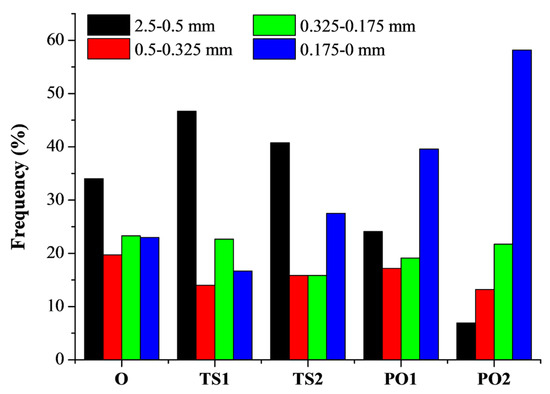 Figure 4). It reveals that composite TS1 contains more fibers above 0.5 mm (46.7%) compared to O (34.0%) and PO1 (24.1%). This suggests that the wet pulp fiber/HDPE mixture reduced fiber broken during twin-screw extrusion due to better plasticity, while dry fibers are fragile and are easily sheared. Fibers less than 0.175 mm accounted for 58.2% of PO2, which is most among these tested methods. This result is closely related with the fiber distribution. The good fiber dispersion implies serious fiber damage.