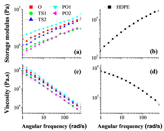 The storage modulus and complex viscosity of PO1 were higher than that of composites O and TS1; this is possibly owing to the relatively even dispersion and better compounding. The evenly dispersed fibers possessed a larger interaction area in matrix than the agglomerated fibers, and the evenly dispersed fibers formed a more effective adhesion with HDPE matrix. Therefore, it is more difficult for the melt polymer to move between the evenly dispersed fibers, resulting in higher modulus.