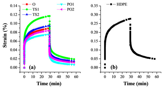 Figure 8). The creep-recovery of pulp fiber/HDPE composites varied between the fabrication methods and was consistent with their flexural property. The composites with higher flexural modulus presented better resistance to creep. The creep and residual deformation of composite PO were significantly lower than that of composites O and TS. This is owing to the fact that they had tight adhesion between pulp fibers and HDPE matrix and exhibited uniform fiber dispersion, limiting the motion of matrix molecules and reduced defect points caused by the lack of matrix penetration. In un-reinforced locations, the matrix behaved like pure HDPE. Thus, the composite TS1 showed the highest strain and the lowest recovery among the five composites, which is attributable to its poor fiber dispersion.