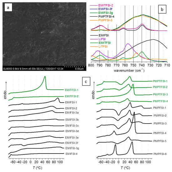 Figure 2a is a SEM image of EMIFSI-3c where abundant isolated TPGS-S can be seen. This is how TPGS-S appears in the electrolytes processed for 20 min and premixed. SEM imaging also indicates (not shown) that few or no crystalline morphologies are detected in these electrolytes, contrary to what happened in electrolytes with less [RTIL] [16], where morphologies related to crystalline order were seen in all electrolytes except those prepared with EMIFSI. In Figure 2b the FTIR spectra of the υ(S-N) region of FSI and TFSI in several electrolytes appear. This vibration is related to the aggregation state of the anions [22]. In the lower half, the same region is shown for the pure compounds EMIFSI, LiTFSI, EMITFSI, and LiFSI. The electrolytes that contain only the TFSI anion show a spectrum almost identical to that of TFSI as in EMITFSI (mild interaction of TFSI with the cation, either EMI or PMP), and the bands corresponding to TFSI, as in LiTFSI (strong interaction between TFSI and the cation), are not seen. This is because, when LiTFSI is added to the mixture of ionic liquid and PEO, Li becomes preferentially coordinated by the PEO chain, leaving TFSI free to become involved in milder interactions with the cations of the ionic liquid. In the electrolytes with a mixture of FSI and TFSI anions, the spectral region is broad and a mixture of species corresponding to TFSI as in EMITFSI (739 cm−1) and FSI as in EMIFSI (or PMPFSI) can be suspected. Again, Li is dissolved by the PEO chain, and the anions TFSI and FSI interact with the ionic liquid cation (EMI or PMP). These spectra suggest that the liquid phase in the electrolytes is closer to the model liquid phases prepared with PEG than to those without PEG (see Figure 1), and so no ionic liquid crystallization is to be expected. Moreover, no extreme differences in viscosity are to be expected either.