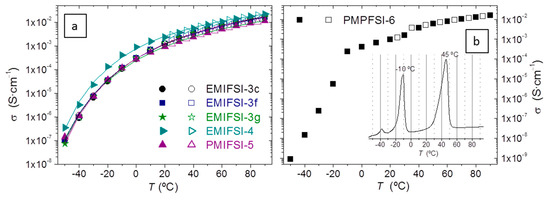 Table 2 contains σ of the different electrolytes at 25 and 70 °C, and Figure 4 represents the variation of σ with temperature in the range −50 °C to 90 °C of a selection of electrolytes. It is remarkable that, though the DSC in Figure 2 shows the phase heterogeneity of the electrolytes, this has, as a rule, little effect on σ, as seen for instance in EMIFSI-3c, EMIFSI-3f, and EMIFSI-3g in Figure 4a—all very similar as regards σ(T) in spite of the different low T phase distribution evidenced in their DSC. Another indication that phase transitions or relaxations are not being reflected in σ(T) is that the σ measurements performed on cooling from 90 °C or on heating from −80 °C coincide absolutely. Moreover, all electrolytes in Figure 4a can be fitted with a single Vogel–Fulcher–Tamman (VFT) equation, ln ( σ ) = ln ( σ ) B T T 0 (Equation (1)), where σ (S·cm−1), B (K), and T0 are constants. The fittings are very good, indicating that the σ(T) dependence is characteristic of a viscous liquid in which σ is governed by η in the whole temperature range, and the VFT fitting of σ(T) reflects the VFT variation of η(T). The fitting parameters appear in Table 4. Minor variations are obtained for T0 and B parameters, related to the activation energy in the samples EMIFSI-3n, indicating that the different processing conditions employed in these electrolytes do not affect σ(T). The main differences between electrolytes with EMIFSI/LiTFSI and PMPFSI/LiTFSI are σ, with the latter being less conductive at high temperatures, which is consistent with the lower η of EMIFSI and its mixtures in Table 3. The fitting of EMIFSI-4 σ results in a set of different parameters because this electrolyte has no Li salt.