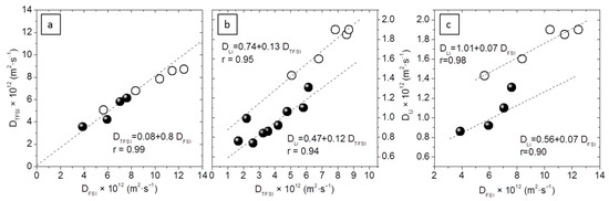 The relationship between the diffusion coefficients appears in Figure 7. In Figure 7a, DTFSI vs. DFSI is represented. A straight line can be fitted irrespective of the type of ionic liquid, salt concentration, amount of sepiolite, etc., the slope of which is the ratio r h F S I r h T F S I , if the Stokes–Einstein equation holds (Equation (3)): D i = kT c π ( 1 r h i ) ( 1 η ) , where k is the Boltzmann constant (1.38 × 10−23 J·K−1), T is the absolute temperature, c is a constant with a proposed value of 5 [25], η is the liquid viscosity, and r is the effective Stokes radius. Then, r h F S I = 0.8 × r h T F S I , a value frequently found in electrolytes containing a high concentration of these anions [26].