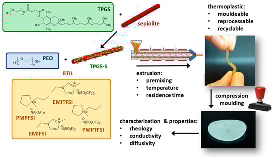 Room-Temperature Ionic Liquids (RTILs) like EMITFSI are extremely interesting as components in electrolytes. Besides their low flammability, which contributes to their safe use, some RTILs have proved to have other advantageous features as electrolytes, namely the ability to form a solid electrolyte interphase (SEI) able to suppress the formation of Li dendrites in the case of Li batteries [9,10,11]. For this purpose, the combination of such RTILs with a polymer to form a solid electrolyte seems very appealing. Unfortunately, RTILs’ high viscosity lowers their conductivity as compared to similar electrolytes containing ethylene (EC) or propylene (PC) carbonates. Some time ago we reported on highly conductive physically crosslinked electrolytes [12,13], processed by melt compounding using PEO, LiTf, EC, and a small amount of an ad hoc modified sepiolite (named TPGS-S) acting as a physical cross-linker [14]. These electrolytes are solid up to 90 °C and show ionic diffusivities similar to those of a chemically analogous viscous liquid, i.e., the materials’ design allowed the decoupling of the rheological macroscopic properties and the microscopic ionic mobility. The electrolytes, prepared by solvent-free procedures, are thermoplastic, and possess remarkable electrochemical stability [15]. Aware of the fact that carbonates should be avoided in favor of safer liquids, we attempted the preparation of analogous electrolytes but substituted the EC liquid fraction by a set of RTILs. This was successfully done [16], in the sense that RTIL-containing, safe thermoplastic electrolytes were prepared with dimensional stability up to 90 °C, but with the RTIL being of higher viscosity than carbonates, the σ values were clearly lower (≈5 × 10−4 S·cm−1 at 25 °C at best). σ also suffered from the fact that LiTf was employed, while LiTFSI now appears to be a much better choice. The current background on the performance of RTILs as electrolytes with and without PEO [1,17,18,19,20] shows that in many electrochemical applications, the incorporation of batteries, capacitors, supercapacitors, or pseudocapacitors in the formulation of electrolytes is a worthy challenge, and hence we undertook the objective of producing mechanically tough thermoplastic electrolytes based on RTILs and PEO with the highest possible liquid fraction, and hence the highest possible conductivity, both with and without Li salt. This work collects the efforts done in this direction, and the results obtained.