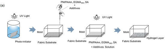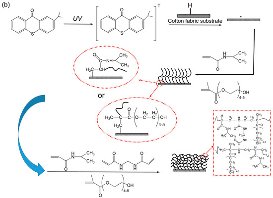 The UV photo-grafting method was used to prepare cotton fabric grafted hydrogels. In the first step, the cotton fabrics were saturated with acetone solution of 0.1 wt % ITX and exposed to UV light for 8 min to form surface photo-initiators. Then, the pre-treated fabrics were placed on the bottom of the mold, and a proper amount of reaction solution was transferred into the mold, in which the given concentrations of NIPAAm, EGMA360, SA, and other additives were dissolved. UV irradiation was carried out in an ultraviolet processor (HWUV400XUV, Zhonghe Machinery Manufacture Co., Ltd., Baoding, China) at room temperature for 30 min. The processor was equipped with a high-pressure mercury lamp (400 W) with a wavelength range of 320–390 nm. After irradiation, the samples were immersed in 1% (w/v) CaCl2 aqueous solution for 24 h and soaked in distilled water to obtain the final purified cotton fabric grafted hydrogels. The procedure and mechanism of UV photo-grafting method is schematically shown in Figure 2.