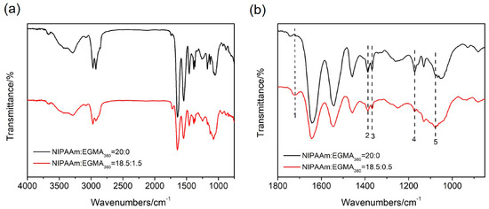 The ATR-FTIR spectra of alginate-Ca2+/PNIPAAm hydrogel and alginate-Ca2+/P(NIPAAm-co-EGMA360) hydrogel were shown in Figure 3. As shown in Figure 3a, the broad band in the range of 3600–3300 cm−1 (O–H stretching vibrations), 2900–2800 cm−1 (C–H stretching vibrations), the amide I band (C=O stretch, ~1643 cm−1), and the amide II band (N–H vibration, ~1545 cm−1) were identified [28]. When zoom-in the ATR-FTIR spectra in Figure 3b, the small absorbance peaks at 1724 cm−1 (guide line 1) was assigned to the C=O stretching vibrations of PEGMA360, the absorptions at 1383 cm−1 (guide line 2) and 1373 cm−1 (guide line 3) were characteristic peaks of PNIPAAm associated with the isopropyl groups, and the absorbance peaks at 1173 cm−1 (guide line 4) was identified to the C–N stretching vibrations [28]. The tiny red shift of the C–O stretching absorption band from 1052 cm−1 to 1083 cm−1 (guide line 5) may have been due to the interactions between the ethoxy groups of PEGMA360 and the hydroxyls groups of SA.