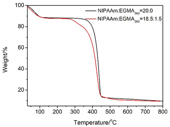 TG curves of alginate-Ca2+/P(NIPAAm-co-EGMA360) hydrogel. The monomer ratios of NIPAAm to EGMA360 are 20:0 and 18.5:1.5.