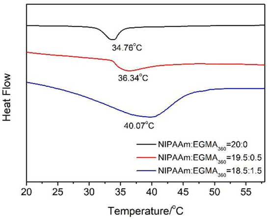 The LCST of alginate-Ca2+/P(NIPAAm-co-EGMA360) hydrogels determined from DSC thermogram is shown in Figure 5, where, LCST was defined as the onset temperature of the endothermic peak. The data indicated that the LCST values of alginate-Ca2+/P(NIPAAm-co-EGMA360) hydrogels with monomers ratios of NIPAAm to EGMA360 of 20:0, 19.5:1.5 and 18.5:2.5 are 34.76, 36.34 and 40.07 °C, respectively. Thus, the LCSTs of hydrogels shit towards higher value with increase of the EGMA360 monomer ratio, which was attributed to the enhanced hydrophilicity. The thermal sensitivity of hydrogels was attributed to their rapid alteration from hydrophilicity to hydrophobicity. Blow the LCST, the hydrophilic groups were bonded to water molecules through hydrogen bonds, and the hydrogels exhibited swollen state in the macroscopic. When the external temperature was increased, the hydrophobic interactions became dominant, leading to shrinkage of the hydrogel [29,30,31]. The introduction of EGMA360 into PNIPAAm would increase the hydrophilicity of the hydrogel network due to the hydrophilicity of EGMA360. Therefore, the hydrogen bonds between the hydroxyl group in the side chain of EGMA360 and the water molecules would be significantly enhanced below the LCST, and higher temperature is required to break these hydrogen bonds.