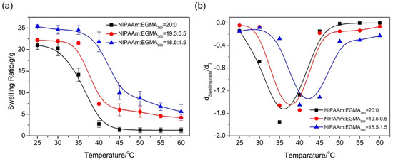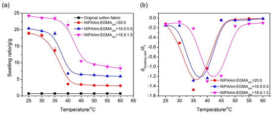 (a) Equilibrium swelling ratio of cotton fabric grafted alginate-Ca2+/P(NIPAAm-co-EGMA360) hydrogels as a function of temperature in water. (b) First derivatives of the equilibrium swelling ratios with respect to the temperature plotted as a function of temperature. The monomer ratios of NIPAAm to EGMA360 are 20:0, 19.5:0.5, and 18.5:1.5.