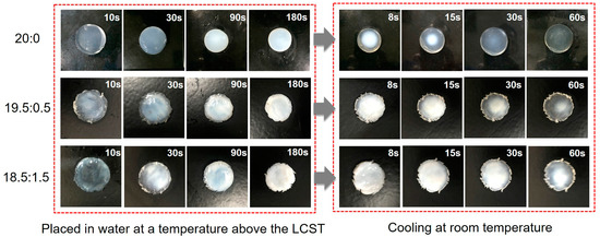 The thermal response of hydrogel to external temperatures was captured by a digital camera under a microscope and presented in Figure 8. The hydrogel exhibited a reversible transparent-to-turbid behavior when the external temperature was controlled to cycle around its LCST.