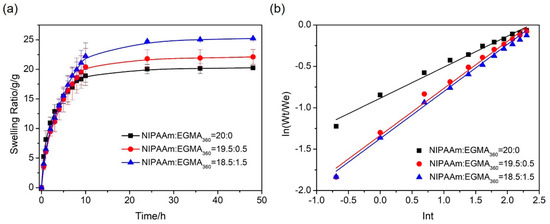 ln(Wt/We) as a function of lnt was plotted in Figure 9b, it was clear that all three hydrogels presented a linear behavior. Fitting coefficients and characteristic indices extracted from these plots are listed in Table 2. The n values are obviously influenced by EGMA360 component, which ranged from 0.37, 0.57 to 0.56 with monomer ratios of 20:0, 19.5:0.5, and 18.5:1.5 (NIPAAm:EGMA360). It indicated that introduction of EGMA induced the shift of diffusion from a Fickian model to an anomalous model.