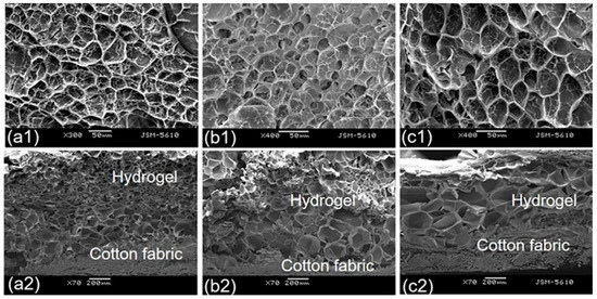 Scanning electron microscopy (SEM) images of the top view (a1–c1) and the cross section (a2–c2) of cotton fabric grafted with alginate-Ca2+/P(NIPAAm-co-EGMA360) hydrogels. The monomer ratios of NIPAAm to EGMA360 are (a1,a2) 20:0, (b1,b2) 19.5:0.5, and (c1,c2) 18.5:1.5.