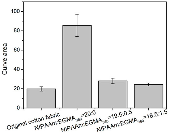 Curve areas of the cotton fabric grafted with alginate-Ca2+/P(NIPAAm-co-EGMA360) hydrogels. The monomer ratios of NIPAAm to EGMA360 are 20:0 19.5:0.5, and 18.5:1.5.