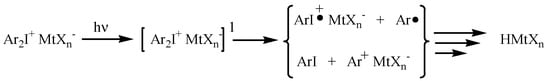 The photodecomposition mechanism of the onium salts first involves photoexcitation and then the decay of the resulting excited singlet state, with both heterolytic and homolytic cleavages. The aryl cations and aryliodine cation radicals generated during photolysis are highly reactive species and further react with solvents, monomers, or impurities to give protonic acids, which are the predominant initiators of cationic polymerization [16,17,18].
