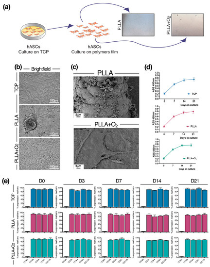 hASCs cultured on PLLA and PLLA+O2 polymer films. (a) Schematic of hASCs on PLLA and PLLA+O2 culture platforms; (b) brightfield representative images of hASCs on TCP, PLLA, and PLLA+O2; (c) FESEM representative images highlight the hASCs spheroids organization on PLLA film and the monolayer fibroblast-like shape on PLLA+O2 film; (d) hASCs viability (XTT assay) on TCP, on PLLA, and on PLLA+O2; and (e) expression of mesenchymal stem cell markers in hASCs at different time points of culture (0, 3, 7, 14, 21) on TCP, on PLLA, and on PLLA+O2. Average values for mesenchymal phenotype markers shown by hASC (n = 3) are reported as the mean ± SEM.